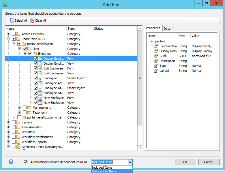 - Select the K2 artifacts (SmartObjects, forms, workflows and reports) to include in the package. The Type column shows what the artifact is, and if you select anartifact you can see its properties in the Properties and Data pane on the right.