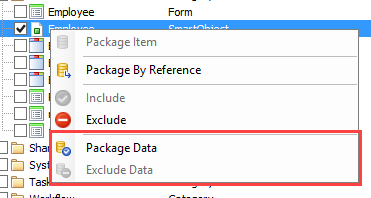By default SmartObjectData is not included, so that SmartBox SmartObject data from one environment is not automatically deployed to a new environment. This is also done to prevent deployment packages from becoming too big . If you need to package the SmartBox data associated with a particular SmartObject, open the SmartObject node and select the option to include data.