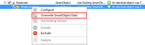 When deploying a package that includes SmartObject data, you have the option to overwrite the data on the target environment if the SmartObject already exists, or to keep the target data.