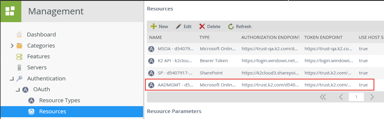 When you integrate K2 Five with SharePoint Online, a resource called AADMGMT is created with your AAD tenant details as well as the parameters necessary to work with the Azure Active Directory Management for K2 app. You can find this resource using the Authentication > OAuth > Resources page in K2 Management.