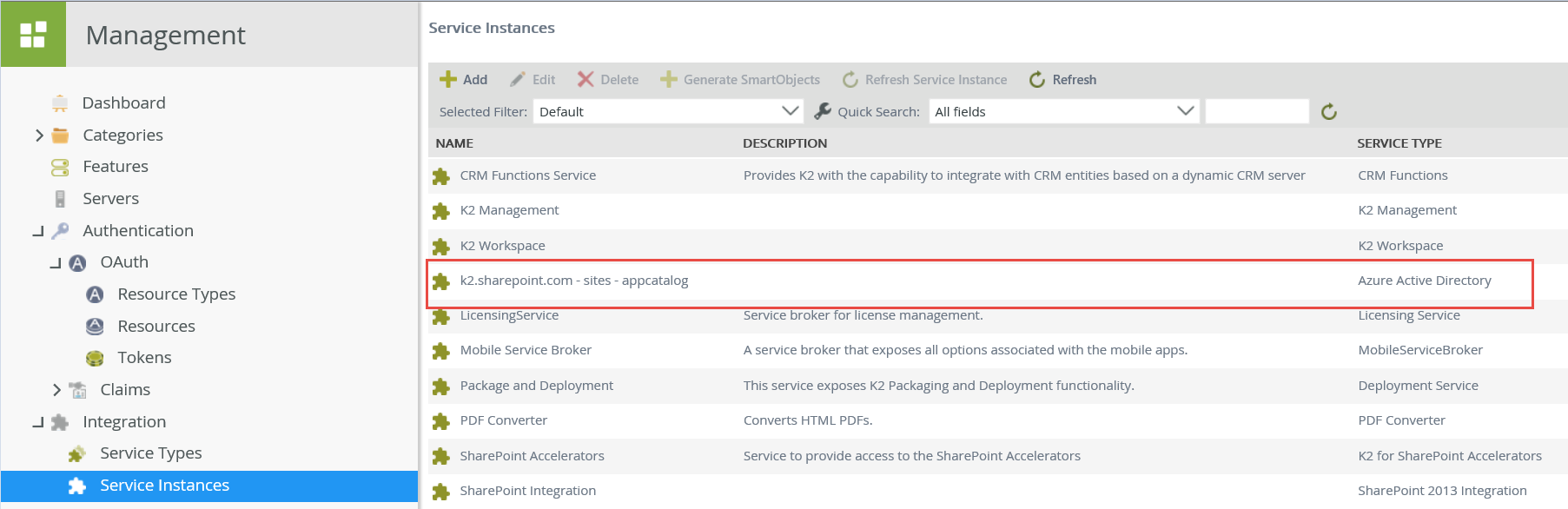 - Find your AAD service instance using the Integration > Service Instances page in K2 Management. It's Service Type is Azure Active Directory.