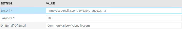 EwsUrl Yes (required) Text http://dlx.denallix.com/EWS/Exchange.asmx The URL of the Exchange Web Services.