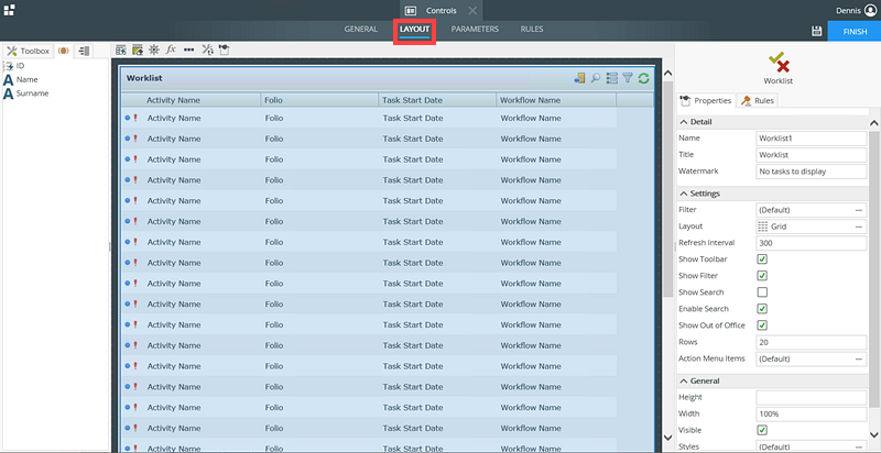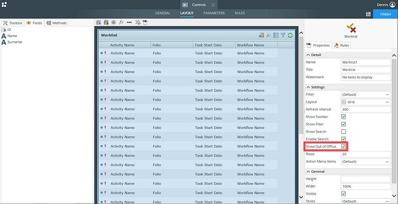 To enable or disable Out of Office, select or deselect the Show Out of Office property on the Worklist control. The Out of Office setting is enabled by default in the Worklist control. Enabling or disabling the feature will do so for all users using the Worklist control.