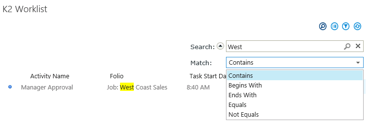 You can refine a K2 Worklist to only display the workflow items that you need to see by using the search and filter functions. For example you might only want to see all the expense claims needing approval at the end of a month. By selecting the search icon, you can display only the workflow items that match your search request.