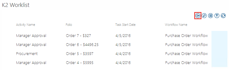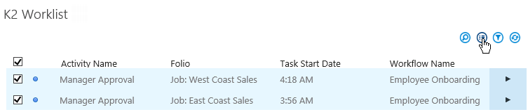 - On the top right-hand side of the worklist, click the multi-select icon to display selection boxes next to each work item in your K2 Worklist.