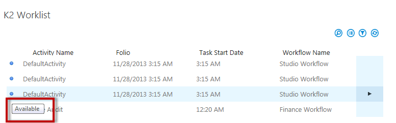 A blue circular icon indicates that a task item's status is Available. When in Available state, a work item can be opened and processed by all users who have that item in their worklists. Hover your mouse over the blue icon to display the status.