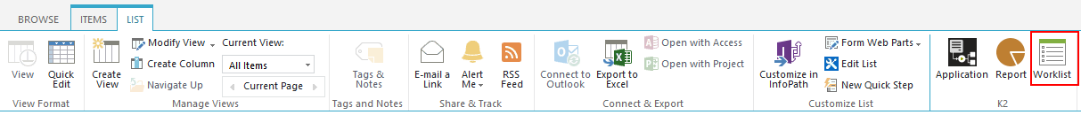 - The Portal page displays your K2 Worklist after you add a K2 Worklist Web Part to a Portal page.