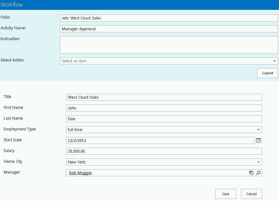 - In the workflow panel on the form, select an action from the Select Action drop-down menu and click Submit, otherwise click Cancel to close the form without completing the task.