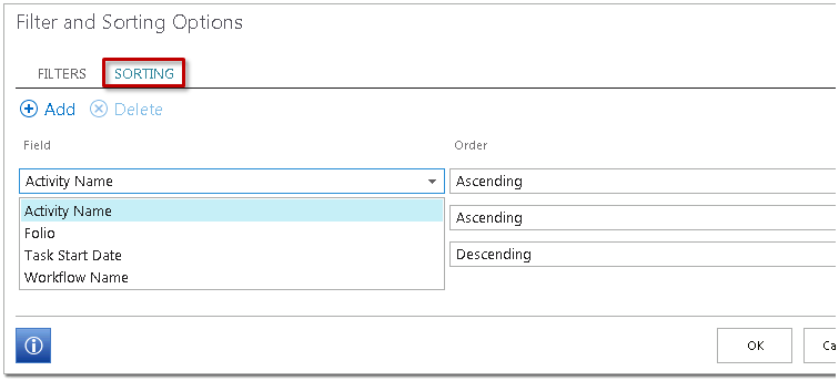 Selecting the Sorting tab allows you to customize the order that items display in your worklist. You can configure multiple sorting options by using the Add button.