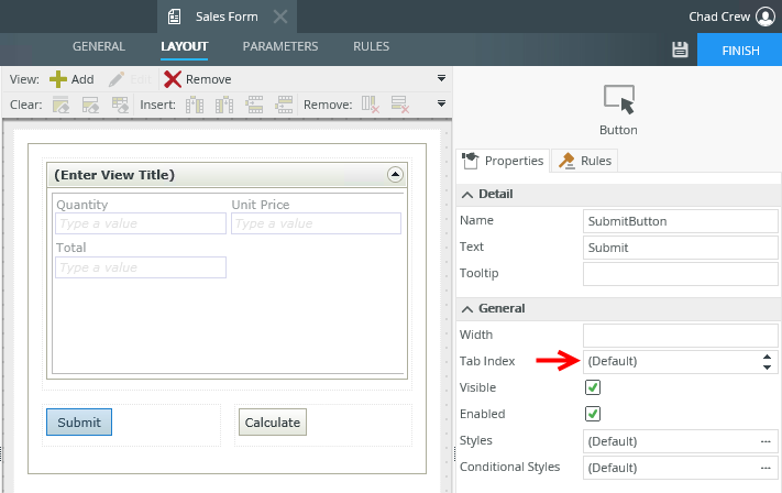 The following images show how tab indexing applies when you have a form with a view and controls. The first image shows a form with two controls and a view with three controls. For this scenario all Tab Index properties remain (Default). The image below shows the setting of the Submit button.