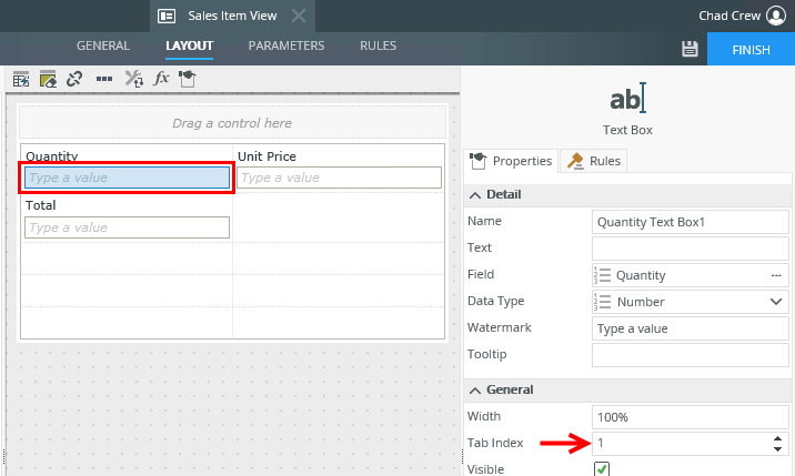 | Tab Index | Use the tab index property of views and controls to define the sequence people using the form can navigate it by the Tab key. The value of the tab index can consist of any valid integer greater than or equal to zero, with lower numbers being earlier in the tab order. When all the controls on the view or form have the default tab index, the browser tabbing order applies. Controls or views that do not have a tab index set (None) are skipped. Tab indexes can range from 1 to 126. |
