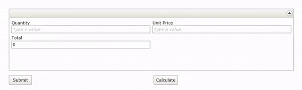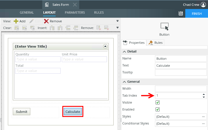 For the second scenario, the Tab Index property of the Quantity control on the view is changed to 1 and the Tab Index property of the Calculate control on the form is also changed to 1.