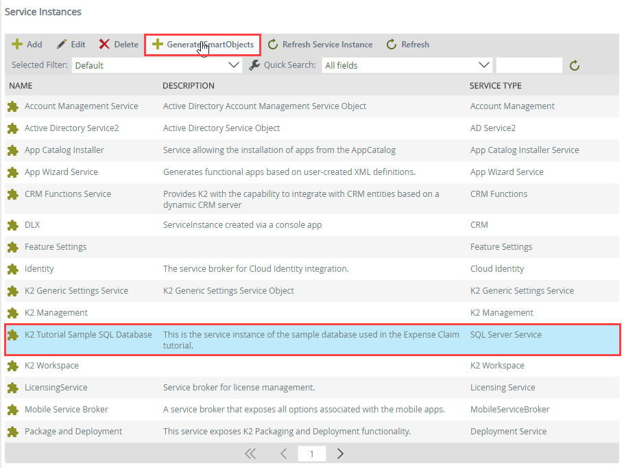 Field Name Setting A Display Name K2 Tutorial Sample SQL Database B Description This is the service instance of the sample database used in the K2 Learning tutorial. Service Type SQL Server Service (default) C Authentication Mode Impersonate (Ensure Impersonate is selected) D On Different SQL Server false E Command Timeout 90 F Database K2Learning G Server LOCALHOST (Alternatively your SQL server name) H Generate SmartObjects for this Service Instance UNCHECKED - In the Management menu, expand the Integration node, then click Service Types. You will see current service types displayed in the central pane. Scroll through the service types until you locate SQL Server Service. You can also use the search option instead of scrolling through the pages. (You may see more than one result returned.)