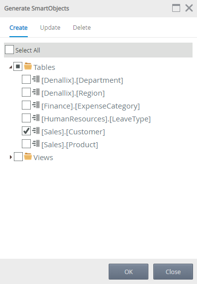 In K2 Management navigate to Integration > Service Instances > K2 Tutorial Sample SQL Database and use the Generate SmartObjectsoption to create a SmartObject of the [Sales].[Customer] table.