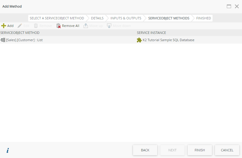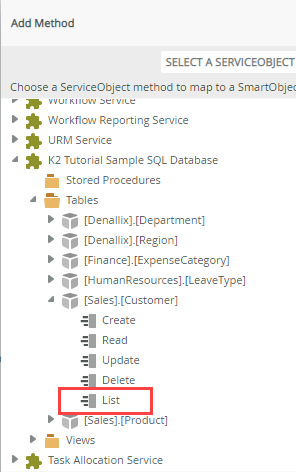- Select the List method of the K2 Tutorials Sample SQL Database > Tables > [Sales].[Customer] table.