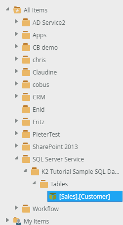 - In K2 Designer, browse your system and navigate to All Items > SQL Server Service > K2 Tutorial Sample SQL Database > Tables and select the [Sales].[Customer] SmartObject.