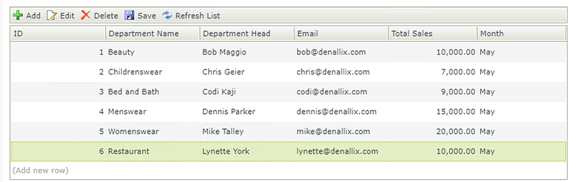 If you are not familiar with creating a SmartBox SmartObject, see How To: Create A SmartBox SmartObject. - From K2 Designer, right click the Department Sales SmartObject and generate an editable list view. Run the list view to populate the SmartObject with data, as in the example below. (You may want to use different email addresses that will work in your environment.)