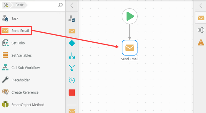 - From the Toolbox, click the Basic category, and drag the Send Email step onto the canvas.