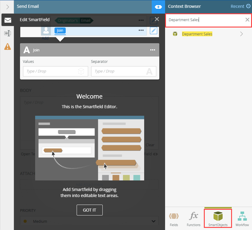 For more information on how to use the Smartfield Composer, see theSmartfield Composer topic. - The Smartfield Composer shows. From the SmartObjects section, enter Department Sales in the search area to locate your SmartObject.