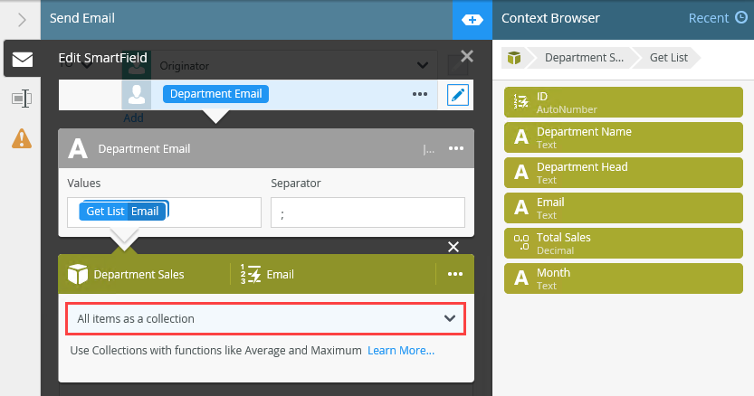 Add and configure the Join function. Locate the Join function from Context Browser > Text section and use the Email property (from the Department Sales SmartObject) to configure the function.