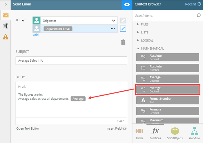 Next, add and configure the Average function. Locate the Average function from Context Browser > Mathematical section and use the function to show the average sales across all departments in the body of the email. This function calculates the average of a collection of values. In the function you use the Total Sales property from the Department Sales SmartObject, and select the All items as a collection option.