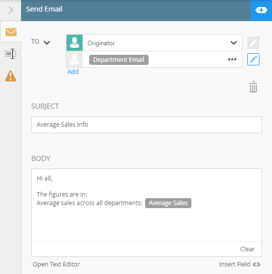 - Click X to close the Smartfield Composer. The configuration in the email body is as follows: