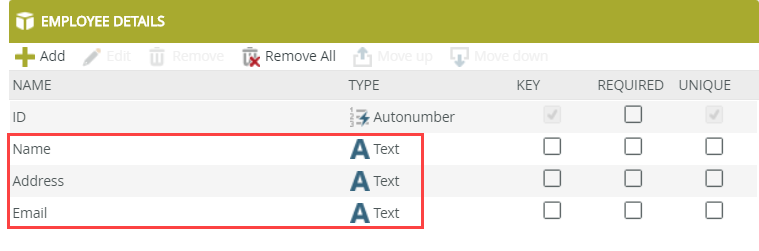 - Create a SmartBox SmartObject called Employee Details with the following properties and data types: