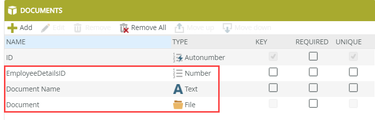 - On the Create Labels and Controls screen, include the Document Name and Document fields (in the Layout section). Enable list editing and allow the user to add new rows (Create method). Click OK.