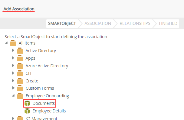 - Click Add. On the Add Association screen, select the Documents SmartObject. Click Next.