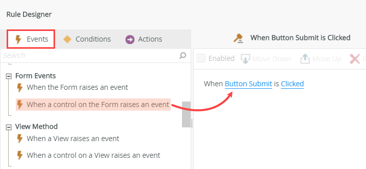 - With the Events tab active, click When a control on the Form raises an event (under the Form Events heading) to add it to the rule definition pane. Because there is only one control on the form, Button Submit is selected by default.