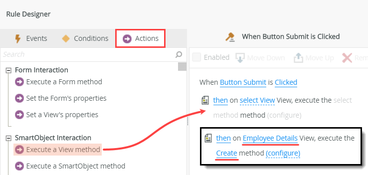 - Select the Actions tab. The first action you add saves the content from the Employee Details view to the Employee Details SmartObject. This is the parent record. Click Execute a View method (under the SmartObject Interaction heading) to add it to the rule definition pane. Click select View and select Employee Details. Click select method and select Create. Click (configure).