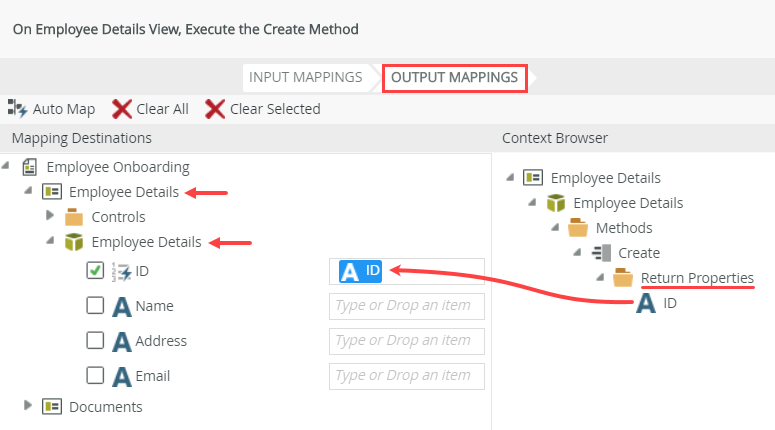 - Click the Output Mappings tab. Map the Return Properties > ID to the Employee Details (view) > Employee Details (SmartObject) > ID property. Click Finish to save the action settings. In this step, you mapped the Employee Details (view) control values to their corresponding Employee Details SmartObject properties. Then, you saved the ID of the SmartObject record that was just created, back to the view SmartObject, so that you can use it in the next step (when you create the child records in the Documents SmartObject).
