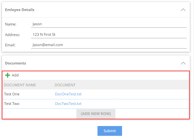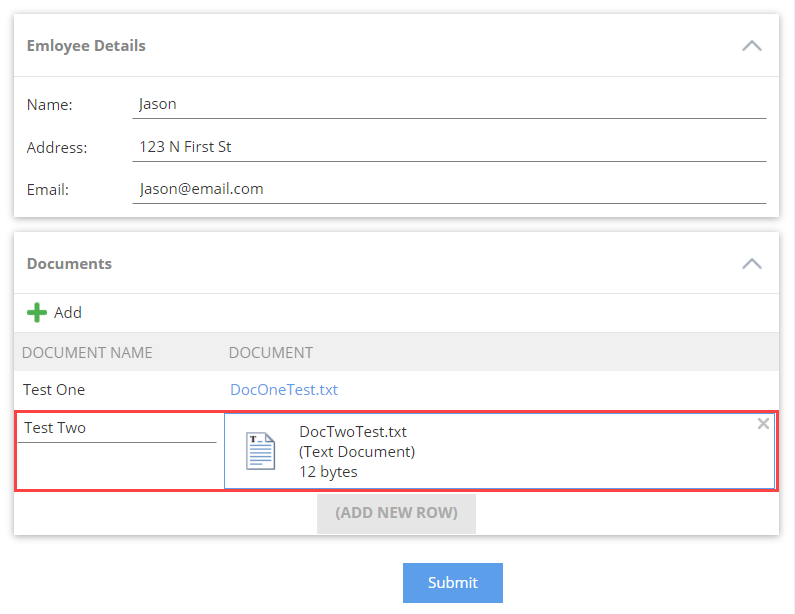 - Add at least one more row on the Documents view and attach a file. Click Submit.