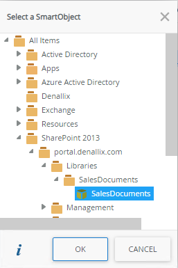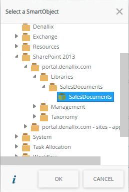 - Select your SharePoint library's SmartObject. In this scenario is SharePoint 2013 > portal.denallix.com > Libraries > SalesDocuments > SalesDocuments.