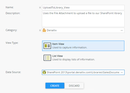 - For the Data Source select your SharePoint library SmartObject. In this scenario the SharePoint 2013 > portal.denallix.com > Libraries > SalesDocuments > SalesDocuments SmartObject is used. Adding the SmartObject as the Data Source for this view adds the context of the SharePoint library, which you use in later steps.