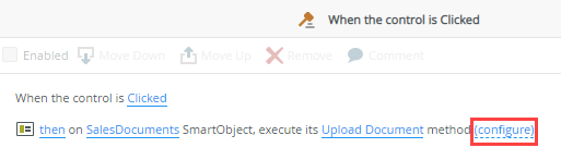 - Add a Button control to your view and configure the button clicked Rule to use the Upload Document SmartObject of your SharePoint library.