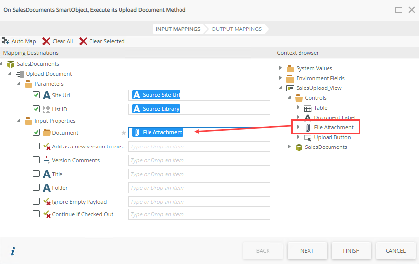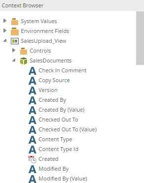 - In the Context Browser expand the SalesUpload_View > SalesDocuments SmartObject.