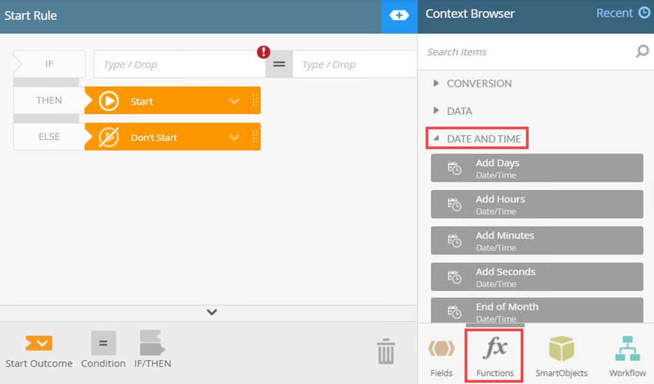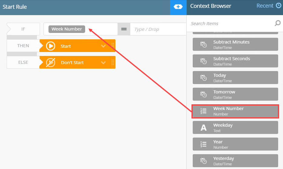- In this scenario, you need to specify that, if the Leave Start Date falls within the last two weeks of the year, the workflow should not start. To do this you use the Week Number function to specify weeks 51 and 52 which are the last two weeks of the year. From the Context Browser select Functions and expand the Date and Time section.