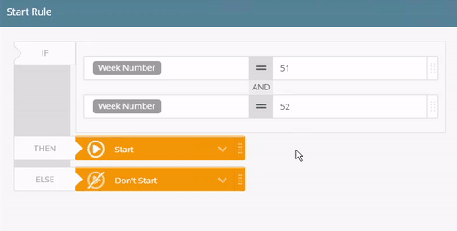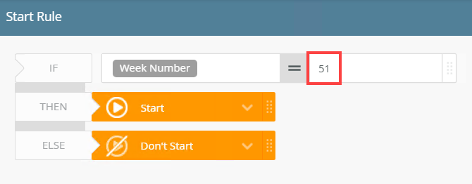 - For the THEN option select Don't Start. If the Leave Start Date occurs in weeks 51 or 52, the workflow won't start. For the ELSE option select Start.