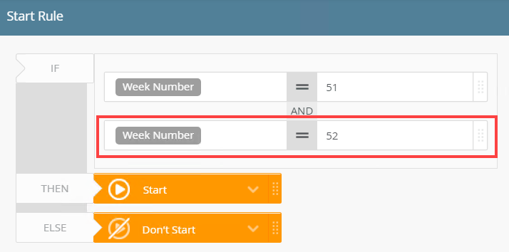 - In the condition block click AND and from the menu select OR. Changing the AND to OR makes sure that either weeks 51 and 52 are evaluated.