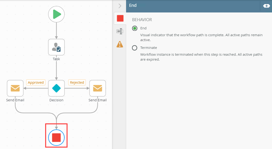 - From the Toolbox, click the Logic category and drag the End step onto the canvas. Connect the step to both Send Email steps.