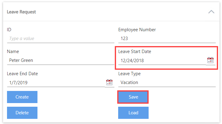 - For the first test, run the Leave Request form and enter the leave details as shown below. Make sure to select the Leave Start Date as the 24th of December. Click Save to submit the form.