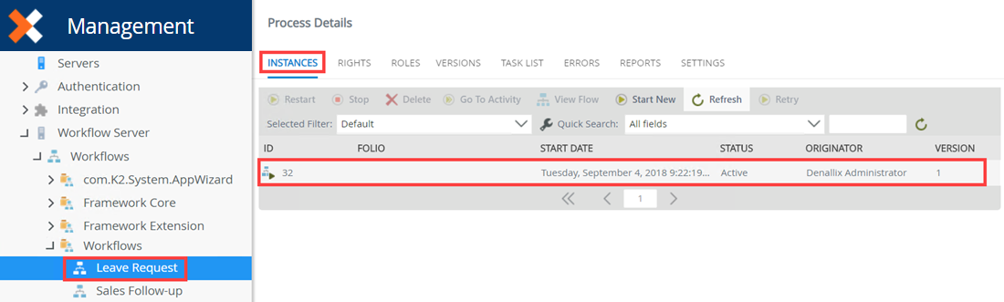 - The conditional start rule evaluates the value you entered in the Leave Start Date field. Because this date falls outside of the last two weeks of the year, the workflow starts. From K2 Management, locate the Leave Request workflow and select the Instances tab. Notice that the workflow started.