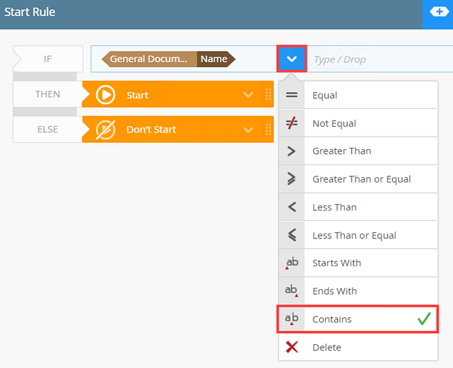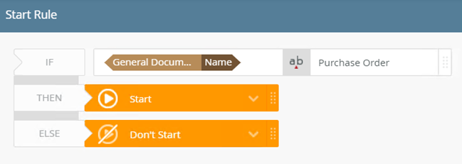- For the THEN option select Start. If the Name contains Purchase Order the workflow starts. For the ELSE option select Don't Start.