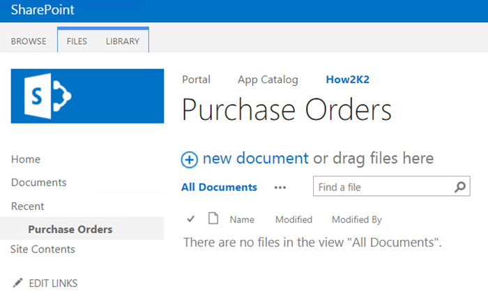 - Create a SharePoint library called Purchase Orders. You use this library to add all purchase order-related documents.