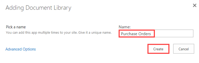 - In SharePoint, create a document library called Purchase Orders.
