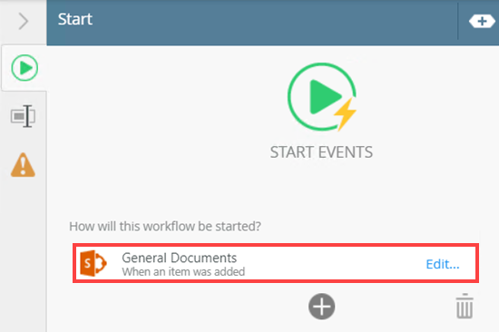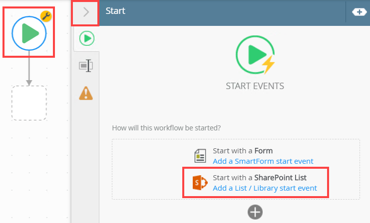 - Select the Start step and click the toggle to expand the Configuration Panel. You can also double-click the step to expand the panel. Select the Start with a SharePoint List option.
