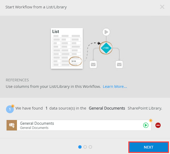 - The Start Workflow from a List/Library page shows. Click Next. You use these references in the conditional rule later on.