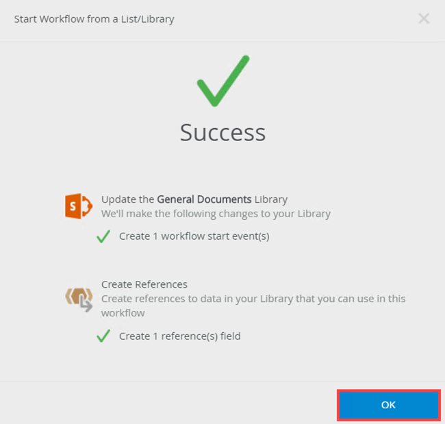 - On the Success page click OK.
