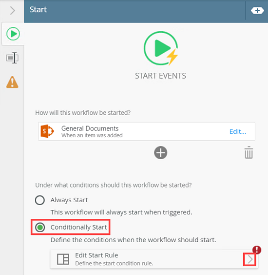 This topic shows you how to use a SharePoint library reference to configure a rule which determines if a workflow should start. You use a Conditional Start Rule to define this logic, and the data comes from the document in a SharePoint library using the automatically-created reference. You configure the Conditional Start Rule on the Start step and build it using the Rules Designer.
